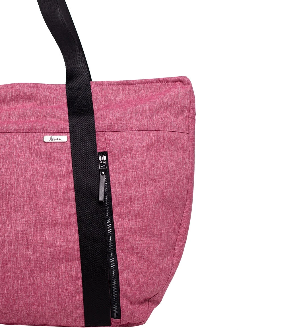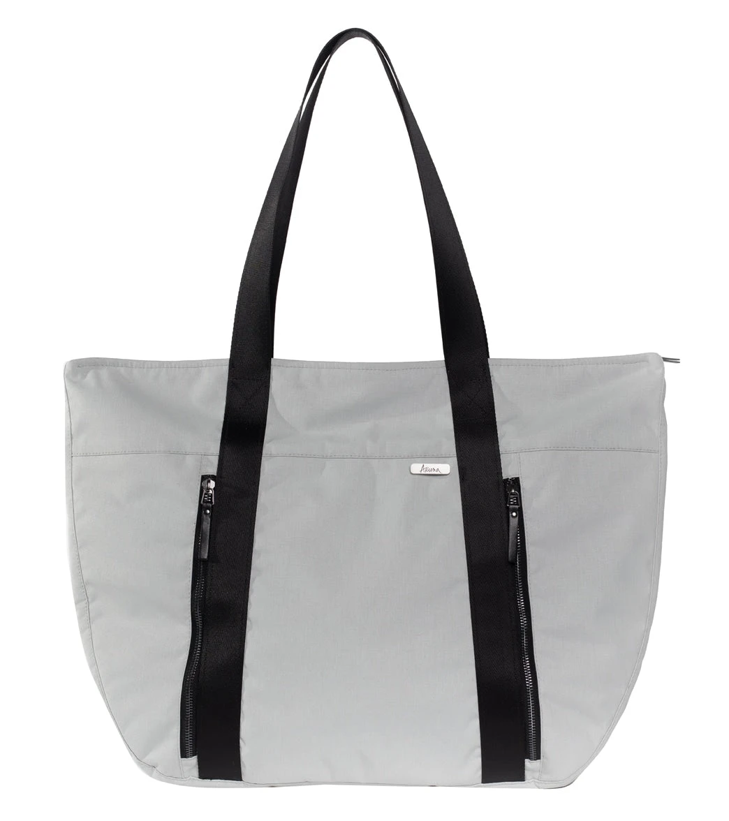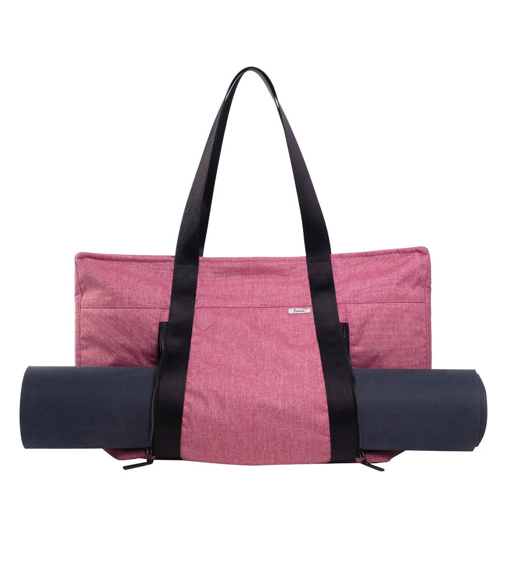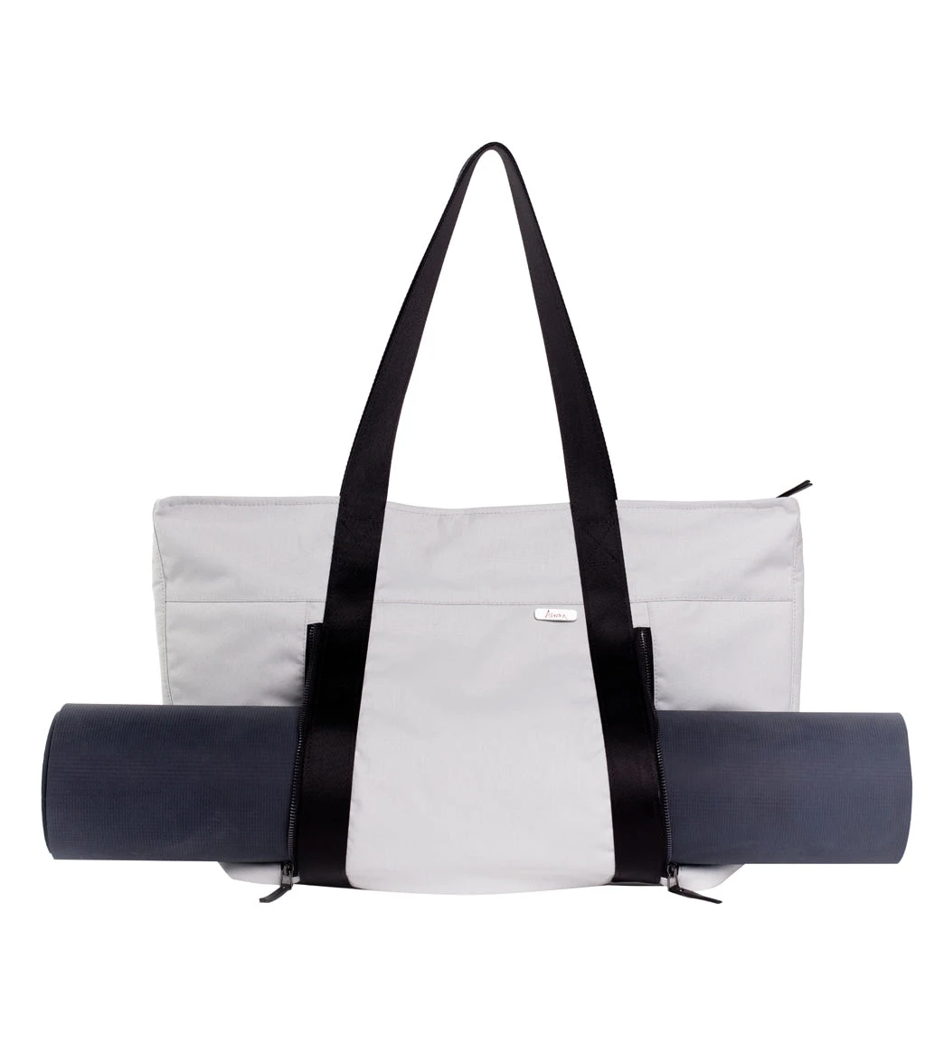The Aruna Project Aamina Yoga Tote is crafted in freedom by the Aruna Artisans and features a water-repellent, abrasion-resistant recycled nylon/polyester exterior, ample space for clothes and shoes, and brushed silver metal hardware.