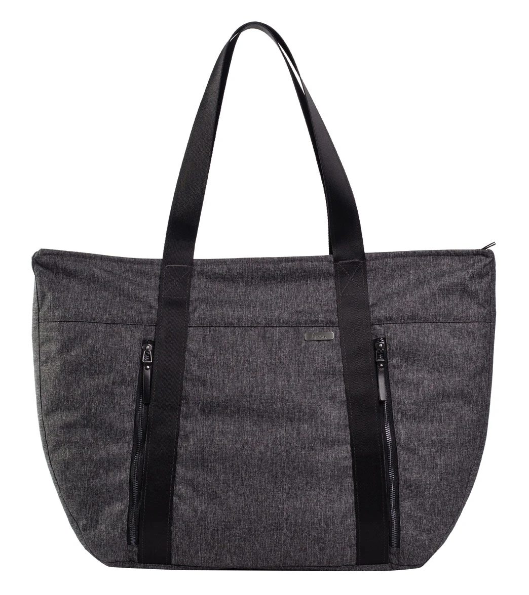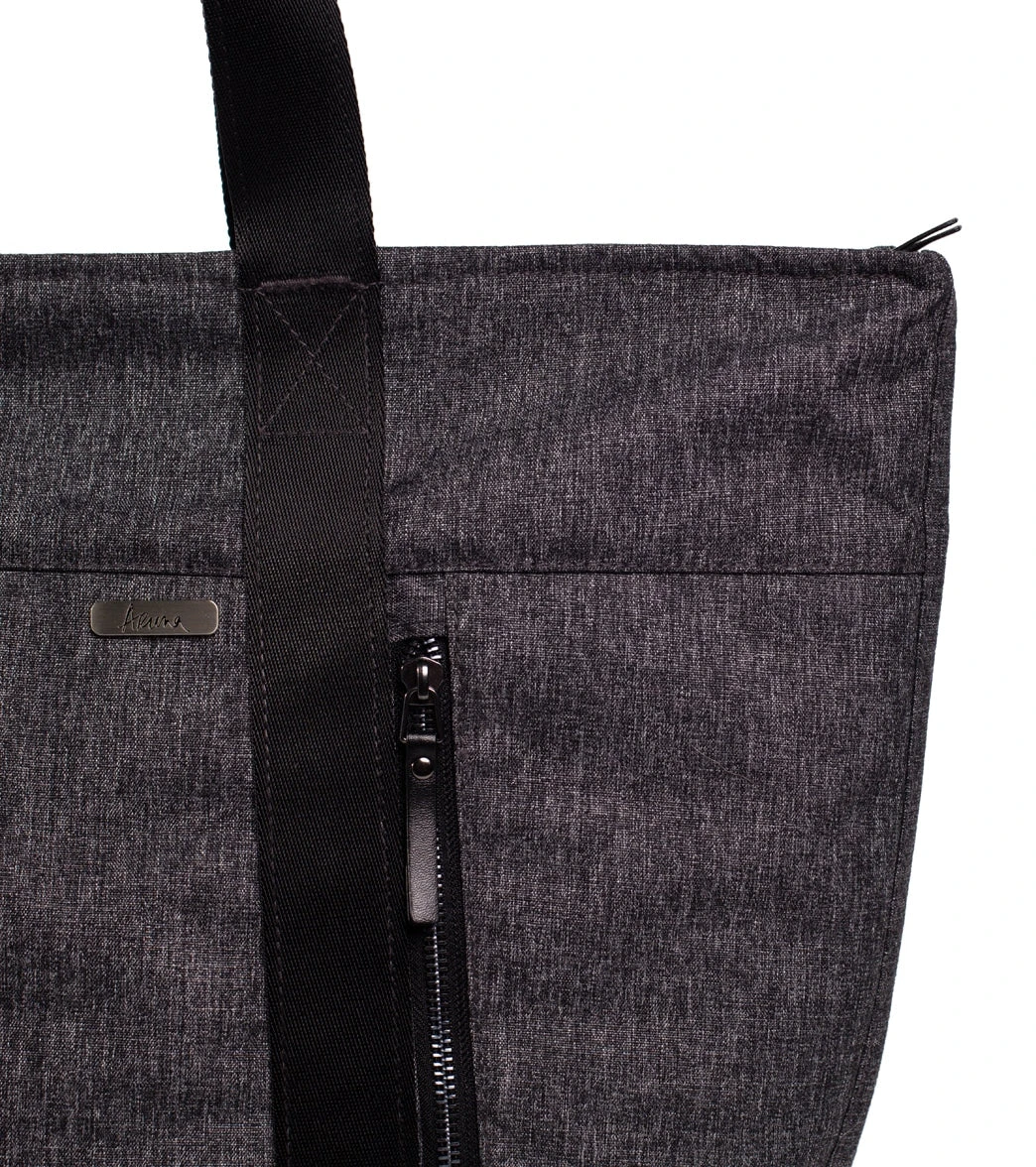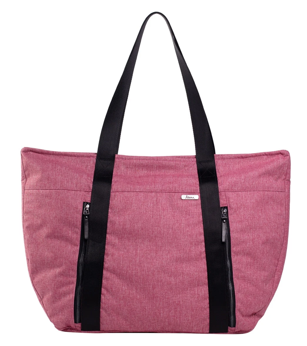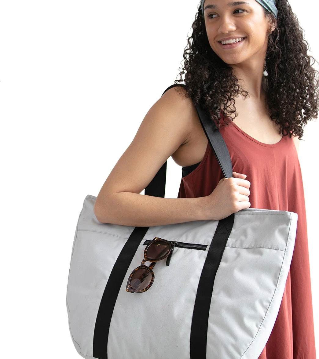 The Aruna Project Aamina Yoga Tote is crafted in freedom by the Aruna Artisans and features a water-repellent, abrasion-resistant recycled nylon/polyester exterior, ample space for clothes and shoes, and brushed silver metal hardware.