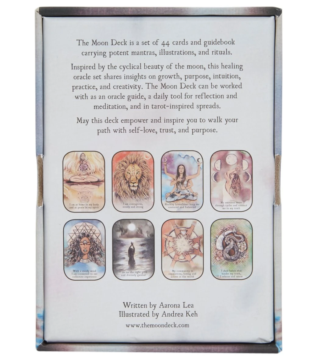The Moon Deck is a tool for connecting to your intuition through a path of self-love and ritual. Complete with a skillfully designed and sturdy printed paper box, a guidebook, and 44 illustrated cards with potent mantras. The Moon Deck can be used as an oracle guide or daily tool for reflection and meditation.